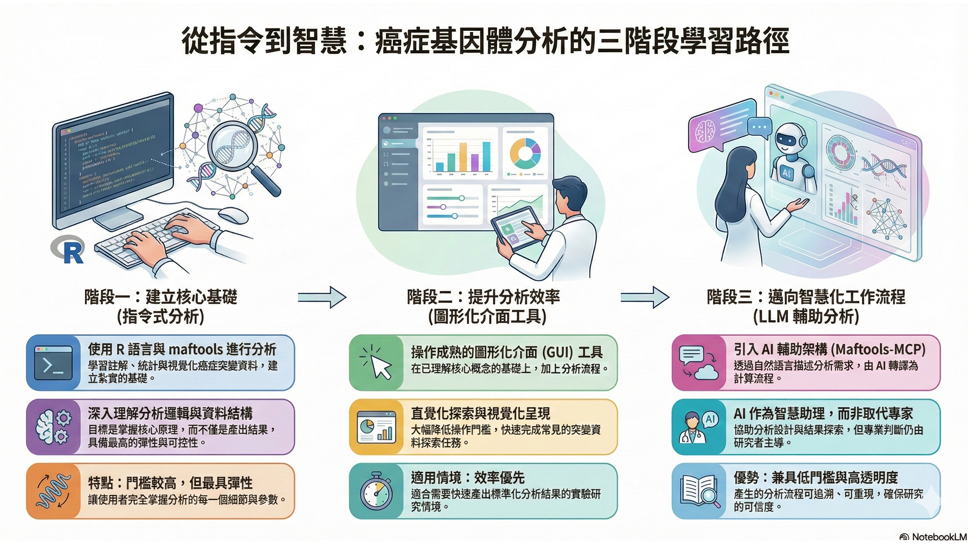 本課程以TCGA 資料庫與 Maftools 為核心,進行癌症體細胞突變資料分析,特別規劃一條分析能力清楚銜接、但實際操作門檻逐步降低的學習路徑,引導學員理解不同分析模式在研究流程中的角色與適用情境,而非僅學習單一工具的操作。 課程首先從門檻較高、但最具彈性與可控性的指令式分析出發,透過 R 語言與 maftools 進行癌症突變資料的註解、統計分析與視覺化,協助學員建立對癌症基因體資料格式、分析流程與統計意義的完整理解。此階段著重於「理解分析邏輯與資料結構」,讓學員掌握分析的核心原理,而非僅產生結果。 在此基礎上,課程將進一步介紹並實際操作現有成熟的圖形化介面(GUI)分析工具,示範如何在已理解分析概念的前提下,以更直覺、低門檻的方式完成常見的突變資料探索與視覺化分析。學員將學習在實務研究中,如何有效運用 GUI 工具提升分析效率,同時理解其背後所對應的分析流程與限制。 最後,課程將引入最新的 LLM(大型語言模型)輔助分析架構(Maftools-MCP),展示癌症基因體分析在 AI 輔助下的全新工作模式。透過自然語言描述分析需求,系統可將研究者的意圖轉譯為可追溯、可重現的實際計算流程,進一步降低分析操作門檻,同時維持分析過程的透明性與可信度。學員將實際體驗 AI 如何作為研究流程中的智慧助理,協助分析設計、結果探索與視覺化呈現,而非取代研究者本身的專業判斷。 本課程強調實作導向與視覺化成果呈現,引導學員實際操作癌症基因體資料分析、解讀分析結果並產出高品質圖表,培養將癌症基因體大數據轉化為可解釋、可應用研究證據的能力,為後續投入癌症研究、精準醫療與相關臨床應用奠定穩固基礎。 課程亮點:
