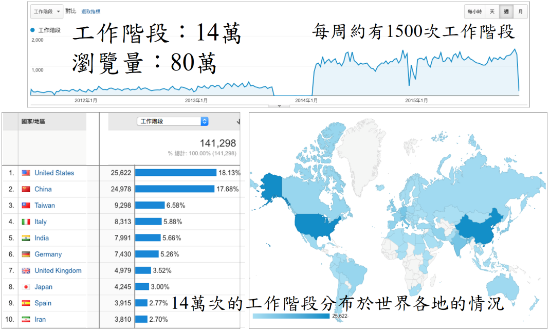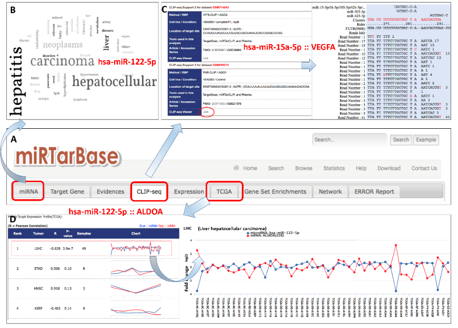 miRTarBase (http://miRTarBase.mbc.nctu.edu.tw) 是由轉譯醫學暨生技研發之生物資訊核心設施(簡稱TMBD核心)黃憲達教授團隊蒐集經過實驗驗證的miRNA-標靶基因(miRNA-target interactions, MTIs) 所建置的資料庫。使用者可以在miRTarBase查詢到經不同實驗方法驗證過的受miRNA調控的基因,也可以反向知道感興趣的基因會被哪些miRNA所調控。miRTarBase 自2011年發表至今,經過兩次重大更新,目前被引用次數超過350次,網站也被高度使用,瀏覽量約80萬次,使用者遍布世界各地,如圖一所示,為世界級的生物資料庫。許多世界知名的生物資料庫收錄了miRTarBase的資料,例如收錄及命名miRNA的miRBase資料庫、收錄完整基因資料庫的GeneCards、及全球收錄最完整的老鼠基因體資料庫Mouse Genome Database (MGD)等。近期一次miRTarBase的更新除了增加miRNA-標靶基因的關係資料量以外,更完整整合了高通量定序資料、癌症基因圖譜 (The Cancer Genome Atlas, TCGA) 及疾病的資料(圖二),讓miRNA-標靶基因的關係不再只是只有 in vitro 的證據,且加入了臨床證據,將更有助於生物醫學的研究。往後生物學家除了可以查詢目前已知的miRNA能調控的基因,也能更進一步觀察miRNA-target network功能及expression profiles of miRNA 與 target gene,來了解miRNA調控某個pathway調控網路的全貌。