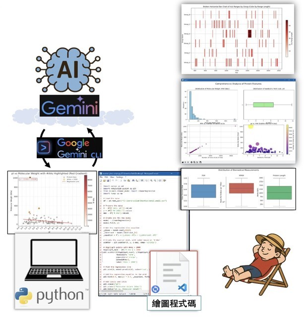 Google Gemini CLI / 打造個人化AI代理人: 課程的進階環節,是帶領學員一步步建構專屬的AI數據前處理與繪圖代理人。透過安裝Google Gemini CLI環境,學員能實現個人化、可控的資料視覺化應用流程。安裝過程涵蓋Python與Node.js的設定,並學習如何登入Google帳號 (/auth) 與測試其基本功能 (請問我的桌面上有甚麼檔案)。當AI生成繪圖程式碼並嘗試執行時,Gemini CLI會停住,等待使用者授權檔案寫入。這再次體現了「繪圖程式碼可檢驗、可重複使用、只提供測試資料給AI,原始數據不外流」的核心原則。透過自然語言指令,學員能繪製多種圖表(如散佈圖、箱形圖、熱圖、堆疊長條圖),並進行細緻調整,甚至要求AI以學術論文「Methods」章節的語調,用英文撰寫圖表說明。